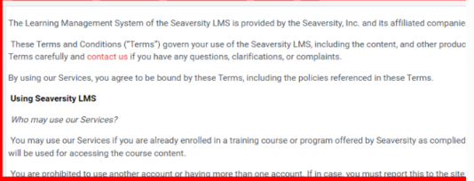 The Learning Management System of the Seaversity LMS is provided by the Seaversity, Inc. and its affiliated companies ("Seaversity").